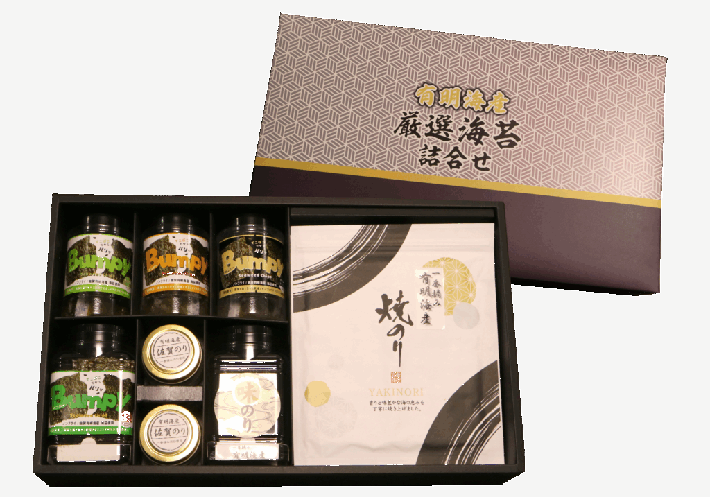 ▶海苔の佃煮と焼き海苔、味付海苔の原料は、佐賀有明海産の一番摘み海苔を使用しています。一番摘み海苔とは、その年に初めて収穫される希少性の高い海苔で、くちどけが柔らかく、味わいや香りが最も優れています。おにぎりやご飯のお供など、毎日の食卓でお楽しみいただけます。